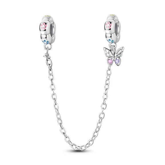 Add elegance and protection to your charm bracelet with this silver safety chain, adorned with de... Read moreAdd elegance and protection to your charm bracelet with this silver safety chain, adorned with delicate butterfly motifs. Designed to secure your bracelet while enhancing its beauty, this chain brings both style and peace of mind. Compatible with most charm bracelet brands.