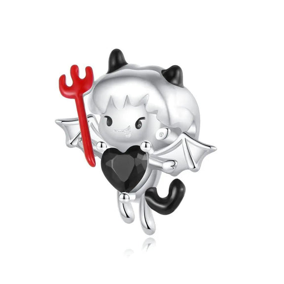 This devil-themed charm is a playful addition to your charm collection, crafted from sterling sil... Read moreThis devil-themed charm is a playful addition to your charm collection, crafted from sterling silver. It features a black heart-shaped gemstone and devil horns, along with a cute red pitchfork accent. The wings and tail add an extra layer of personality to the design, making this charm perfect for those who like quirky, fun jewelry. This devil charm is a unique choice for adding a bit of edge and a whimsical twist to your charm bracelet or necklace. Whether for Halloween or everyday fun, this charm will make a bold statement.