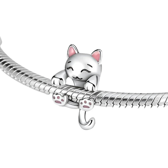 Add a playful touch to your bracelet with our Sterling Silver Hanging Cat Charm. This adorable ch... Read moreAdd a playful touch to your bracelet with our Sterling Silver Hanging Cat Charm. This adorable charm features a cute cat playfully hanging from your bracelet, showcasing its tiny pink paws and endearing expression. Crafted from high-quality sterling silver, this charm is designed to fit perfectly with Pandora charms, making it a delightful addition to any bracelet. The charming design and intricate details make this charm a perfect gift for cat lovers and those who appreciate whimsical jewelry. Let this charming cat remind you of the playful moments and the joy pets bring into our lives.