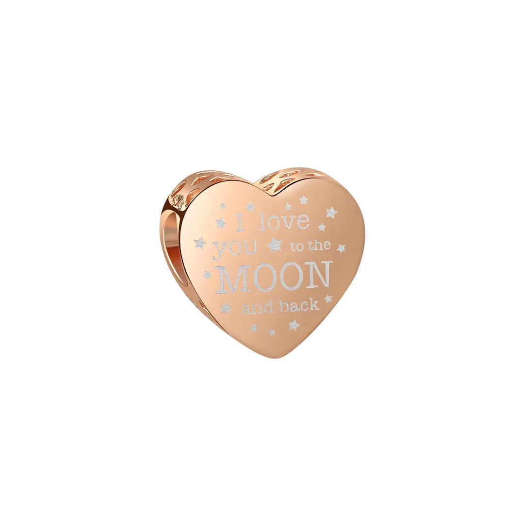 Capture the essence of limitless love with this rose gold heart charm. Featuring the engraving "I... Read moreCapture the essence of limitless love with this rose gold heart charm. Featuring the engraving "I Love You To The Moon & Back" surrounded by delicate stars, it's a perfect gift to celebrate love, friendship, or family.