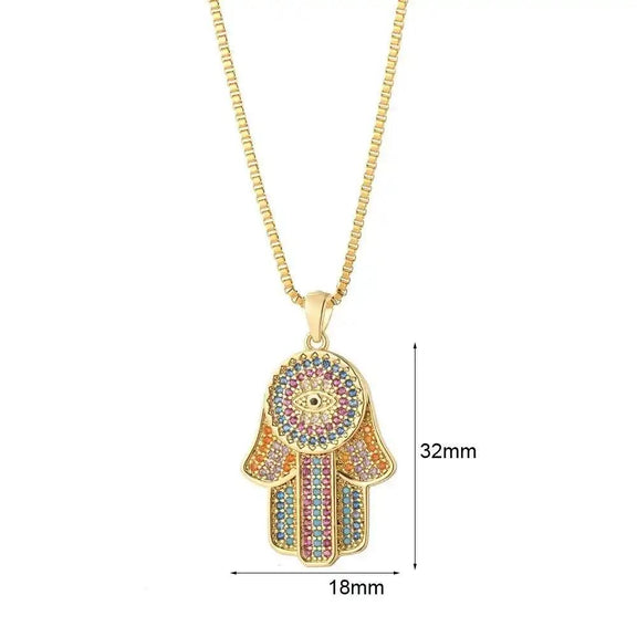 Embrace the charm and protection of the Multicolor Hamsa Hand Pendant Necklace. This exquisite pi... Read moreEmbrace the charm and protection of the Multicolor Hamsa Hand Pendant Necklace. This exquisite piece features a gold-plated Hamsa hand adorned with sparkling multicolor crystals. Measuring mm by mm, the pendant captures the intricate details and symbolizes good fortune. The gold-plated chain adds an elegant touch, making it perfect for any occasion. Crafted with high-quality materials, this necklace ensures durability and timeless beauty. Add a touch of spirituality and style to your jewelry collection. Wear it solo or layer it for a trendy look. Order now and invite positivity into your life!