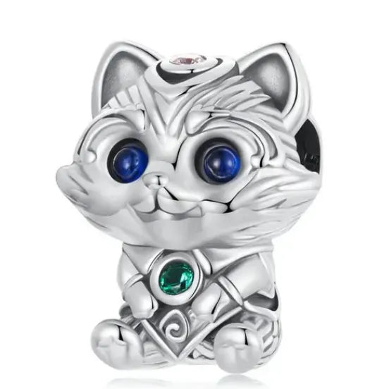 This charming cat charm features dazzling blue eyes and sleek sterling silver detailing. Elegant ... Read moreThis charming cat charm features dazzling blue eyes and sleek sterling silver detailing. Elegant yet adorable, it's ideal for animal lovers who want to add personality to their bracelet. Fits all major charm brands.