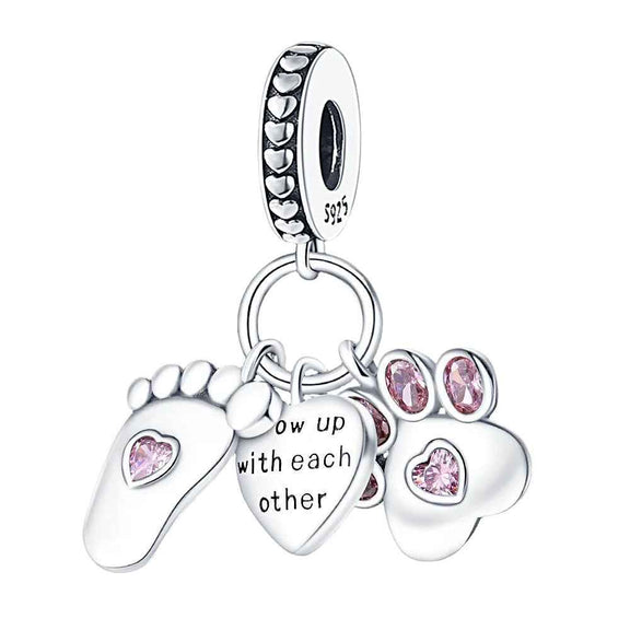 Celebrate the bond between you and your furry friend with our Sterling Silver Paw Print and Footp... Read moreCelebrate the bond between you and your furry friend with our Sterling Silver Paw Print and Footprint Charm. Featuring a paw print, a baby footprint, and a heart charm with pink crystals, this charm is perfect for pet lovers and new parents. Made from high-quality sterling silver, it's ideal for those who cherish sentimental jewelry. Add this charm to your bracelet to keep a token of love close to you. Perfect as a gift for someone special or a heartfelt treat for yourself, this charm is sure to touch hearts. Order now and celebrate love! It can also be used as a sterling silver necklace charm.