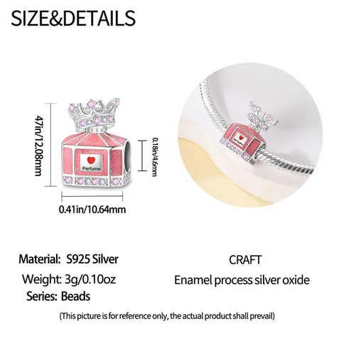 View full detailsCharm FeaturesThe Elegant Pink Perfume Bottle Charm with Crown for Charm Bracelets Compatible with Pandora Bracelets with pink & silver color reflects an elegant style for your bracelet.