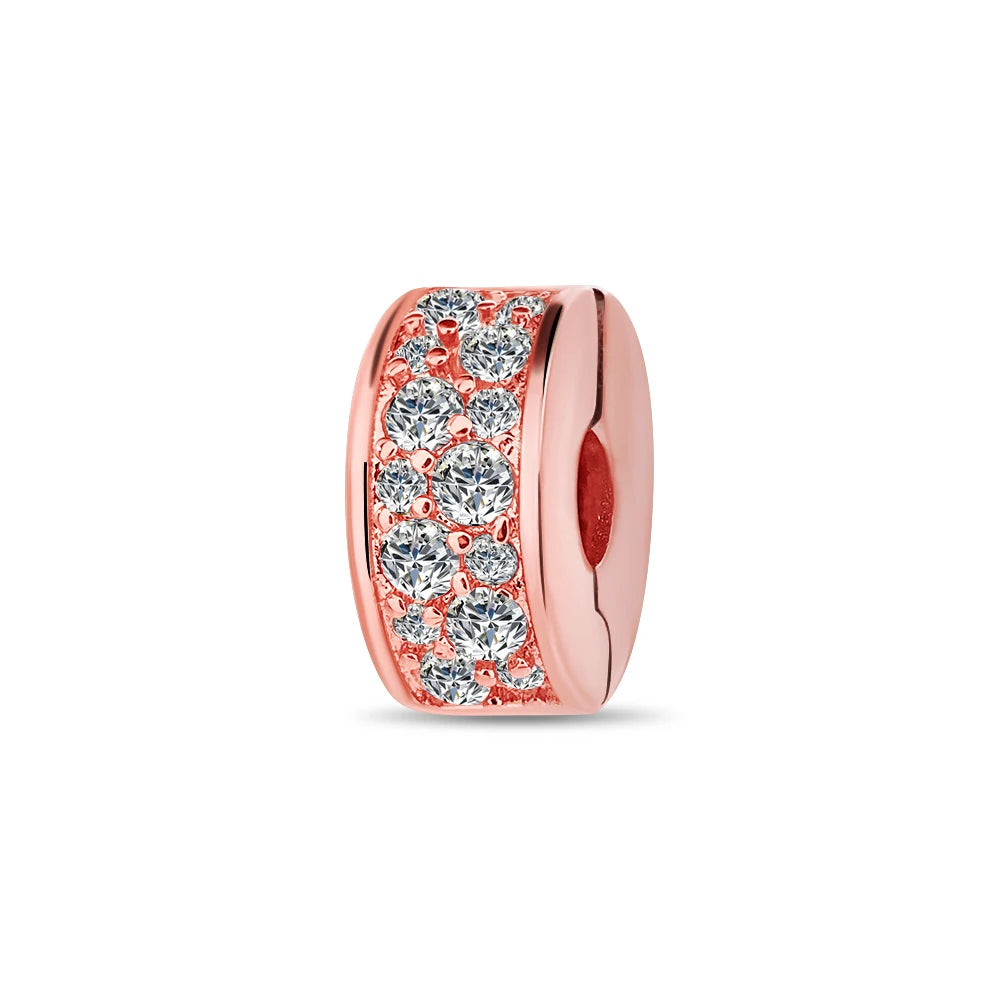 Add a touch of elegance to your charm bracelet with this Stunning Rose Gold Charm. Featuring bril... Read moreAdd a touch of elegance to your charm bracelet with this Stunning Rose Gold Charm. Featuring brilliant clear diamond accents, this charm shines with unmatched brilliance. The smooth rose gold band is beautifully complemented by a row of sparkling diamonds, creating a timeless piece that radiates luxury. Crafted with precision and care, this charm promises durability and lasting beauty. It's the perfect gift for a loved one or a glamorous addition to your own collection. Embrace sophistication and make a statement with this exquisite charm. Order now and let your jewelry sparkle